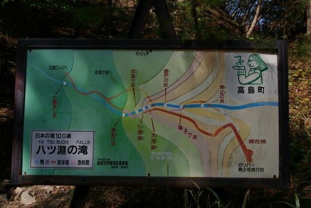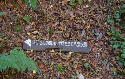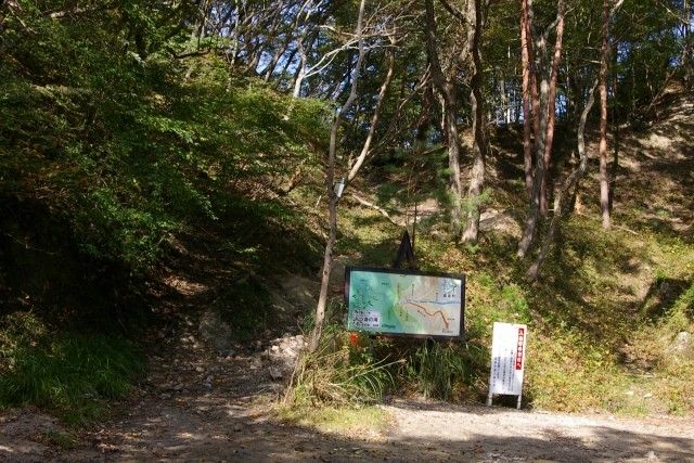 最初は林道を歩きますが、やがてここで山道に変わります。滝の案内図もあります。
