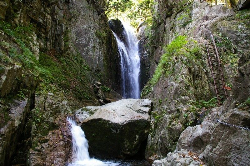 これまでずっと右岸を来た登山道は、滝の下で初めて左岸に渡ります。鎖やはしごで左岸を高巻きします。