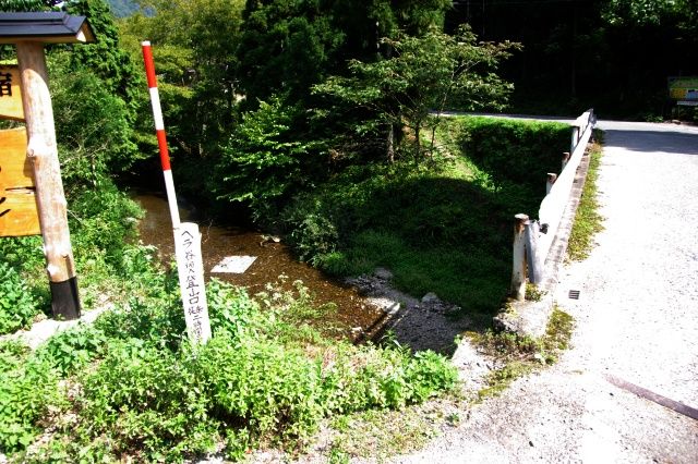県道783号線が針畑川を渡る橋のたもとに、白い登山口標があります。ここは、三角点から北東に延びる尾根での登山口。