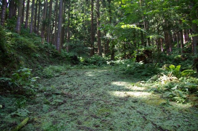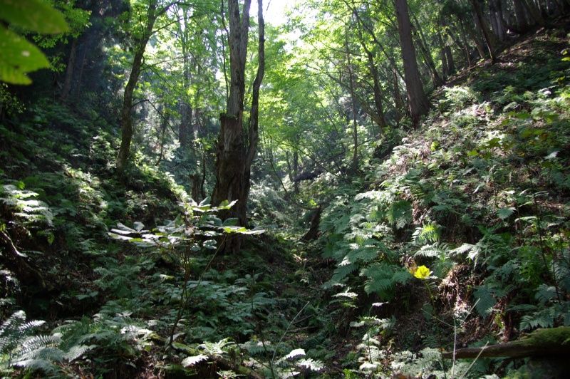 苔むした林道はやがて終点を迎えます。この先、はっきりした道はありません。谷は二方に分かれています。