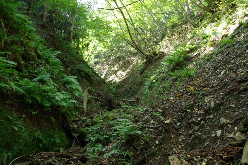 細い谷筋です。苔むして湿った涸れ滝を、左右の土手に登って慎重に越えながら登ってきました。