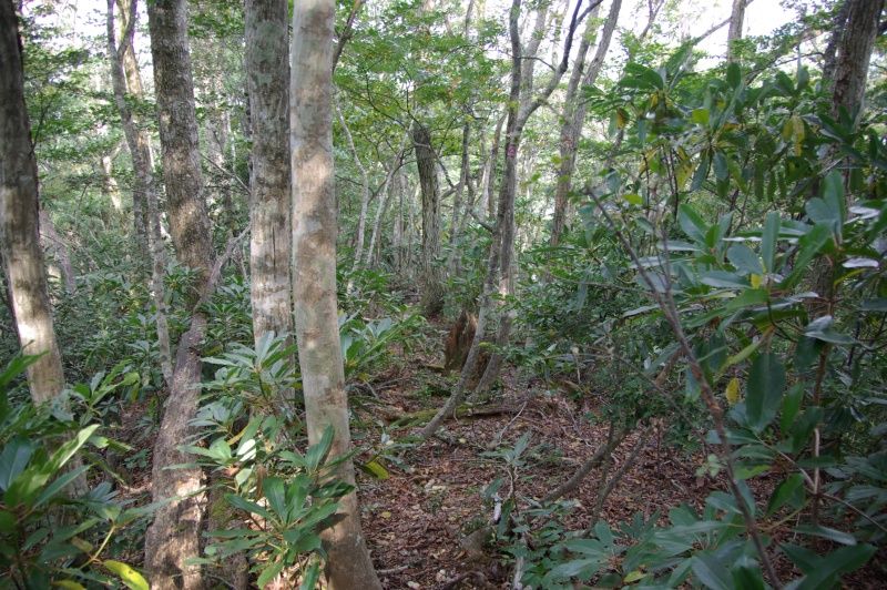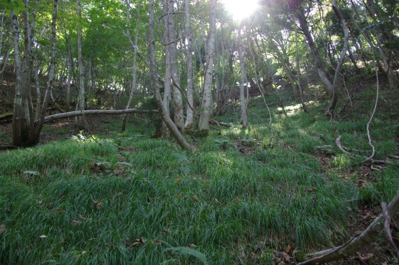 東南東への尾根は末端で二つに分かれ、ここは慎重にコンパスを見ながら北東向きの尾根へと入っていきます。しばらく下ると、