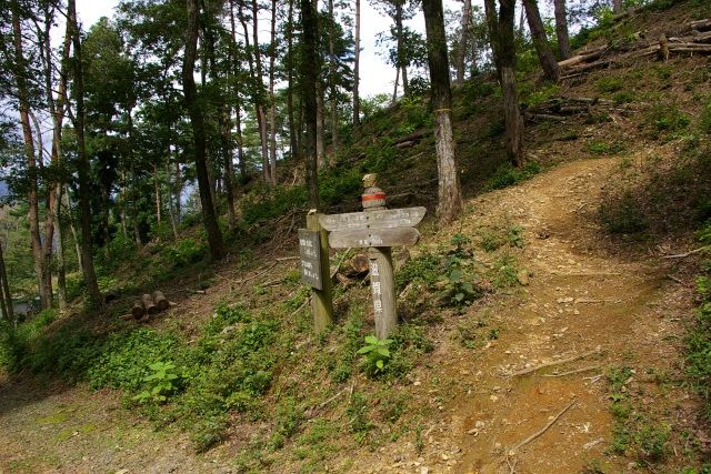 ここで、指月谷(カツラ谷)からの道と合流します。向こうは通行禁止で、紐が張ってあります。