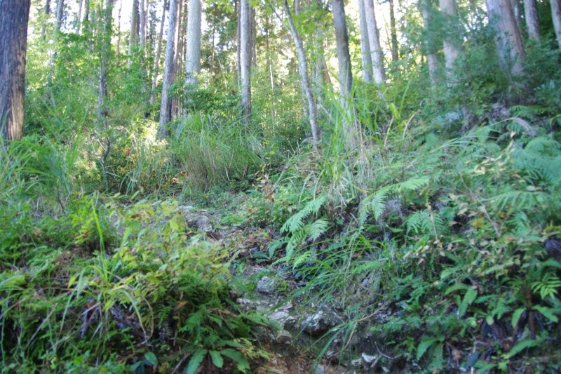 その後車道はしばらく尾根の左側を通りますが、車道が右に出るところで車道を離れて尾根道に入ります。こんな道を進んでいくとやがて・・・。