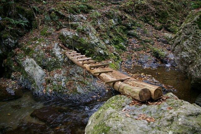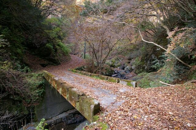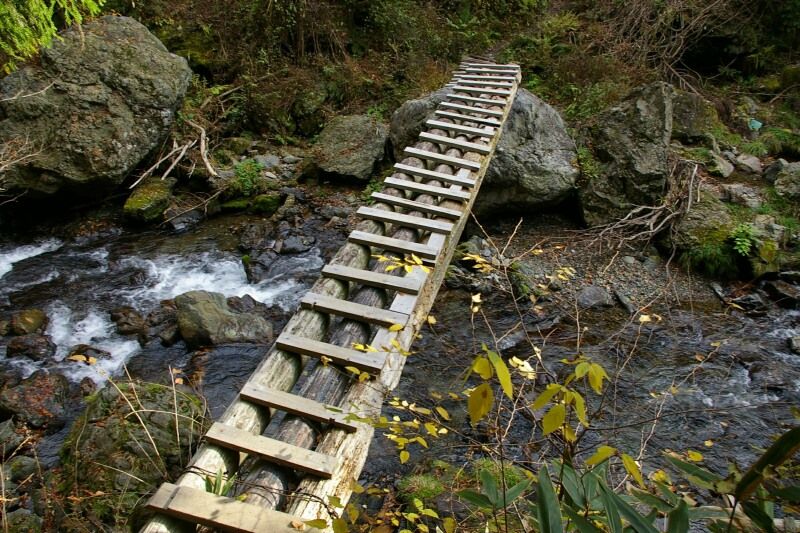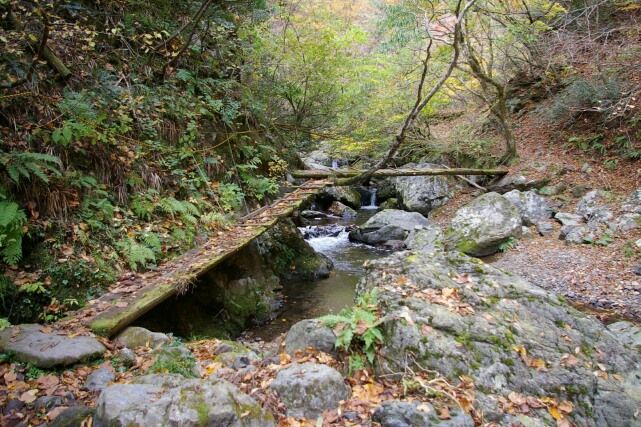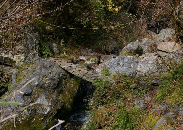 発電所の先で林道が尽きると、このような橋が何カ所か架かる谷道となります。