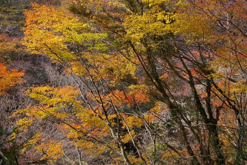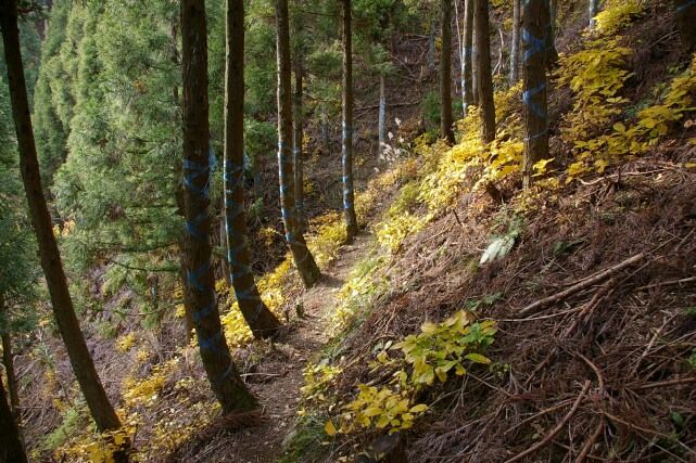稜線といっても、すぐ巻き道となり、植林帯に入りました。下草も紅葉して綺麗です。