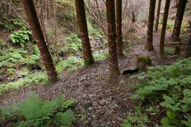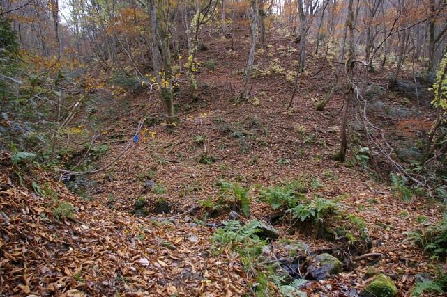 踏み跡がはっきりしませんが、とりあえず谷に沿って登っていきます。時折テープがありました。