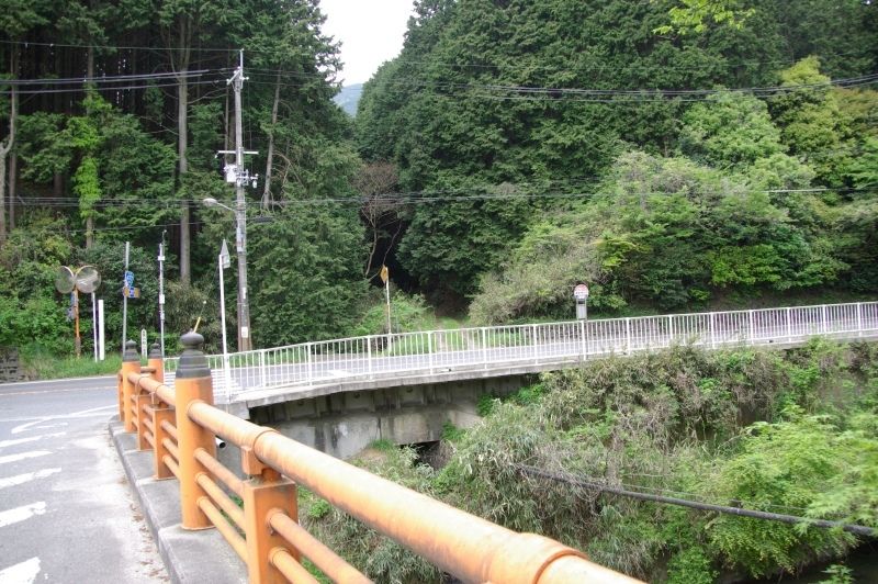 神社前の橋から西を見たところです。左右に国道477号線がはしっています。右寄り、バス停の左の林道が宮メズラへの入口です。