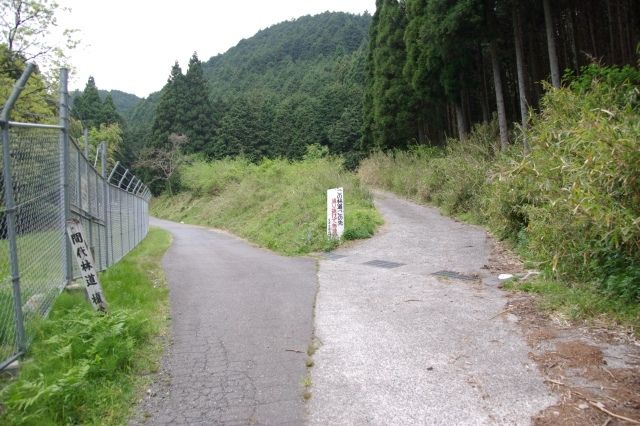 峠を東に下ると、すぐに地道の林道に出ました。ここはさらにその先、地道(途中からコンクリート舗装)の林道を下って、アスファルト道(間代林道)と出合うポイントです。
