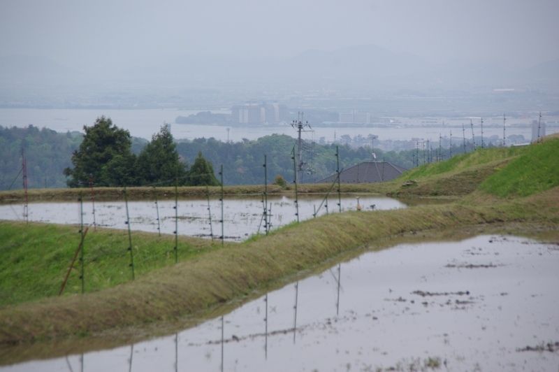 霞の中、田植え前の田圃の向こうは琵琶湖です。