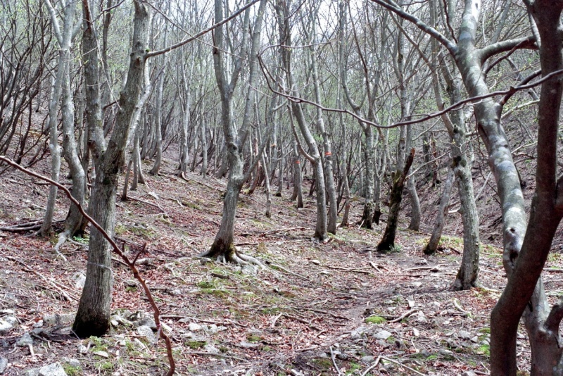 最初は主に杉の植林を登ります。やがて、二次林も出てきます。最初は稜線を右に見ての山腹道が続きます。