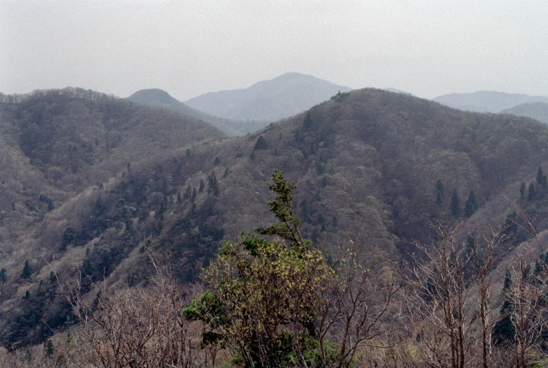 国道421号線を永源寺方面から三重県方面に向かうと、杠葉尾のあたりで、右手に「銚子ヶ口岳 登山口」の、りっぱな看板があり、前々から一度は登らなきゃと思っていました。ようやく、2001年のGWに時間ができたのでトライ。最初は杉の植林帯を比較的急な傾斜で登り始めます。GWの頃なら、写真にあるように、イワカガミやマムシグサが迎えてくれます。右に尾根を見ながら、尾根の中腹を登るこの道は、なかなか良くできたコースで、途中からは余り傾斜もきつくなく、標高をかせいでいきます。左の神崎川本流、あるいは風越谷の水音が聞こえなくなると、道はとうとう尾根を右に越え、今度は右から須谷川の沢音が聞こえてきます。ここからは、尾根を左に見ながら、徐々に須谷川が近づいてきて、とうとう沢を渡るところもあります。そのあたりから、時折、後方に割山、不老堂、岳などが見えます。また、ミツバツツジやミヤマカタバミが咲いていました。さらに登ると、傾斜は緩くなり、明るい林状の須谷川源頭部に出ます。流れはもうちょろちょろです。ここからはもう一登り、一気に、稜線に上がり、少し右に登ると、東峰の山頂です。北は御池、南は鎌、そのほか、藤原、竜、釈迦、御在所、イブネ、雨乞・・・・みごとな360°の眺望、しかも短い草しかなく、お弁当には最高のポイントです。三角点は、そこから5分ほど尾根上を行くと出てきます。ここには灌木が茂り、眺望はありません。さらに進むと、10分ほどで、中峰に達します。そこから左に進むと南峰。東峰からは見えなかった綿向山が姿を見せてくれます。イブネの巨体も印象的でした。