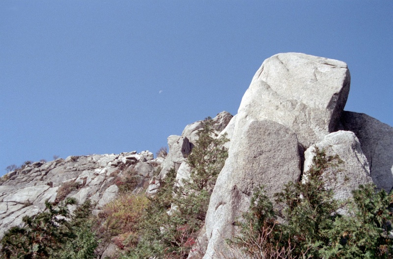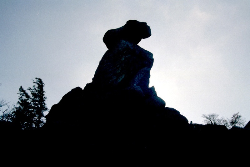 登り初めて半時間ほどで巨大な花崗岩のところに出ます。負ばれ岩です。これはもうオブジェといってもいいほどです。