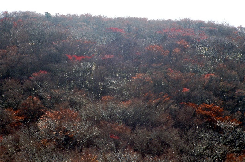 葉の落ちた樹木で山肌がベルベットのように柔らかく見えます。
