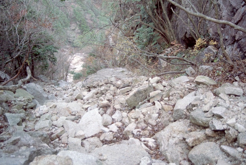 ガレた沢を下るこのあたりは、かなりの悪路で落石注意。