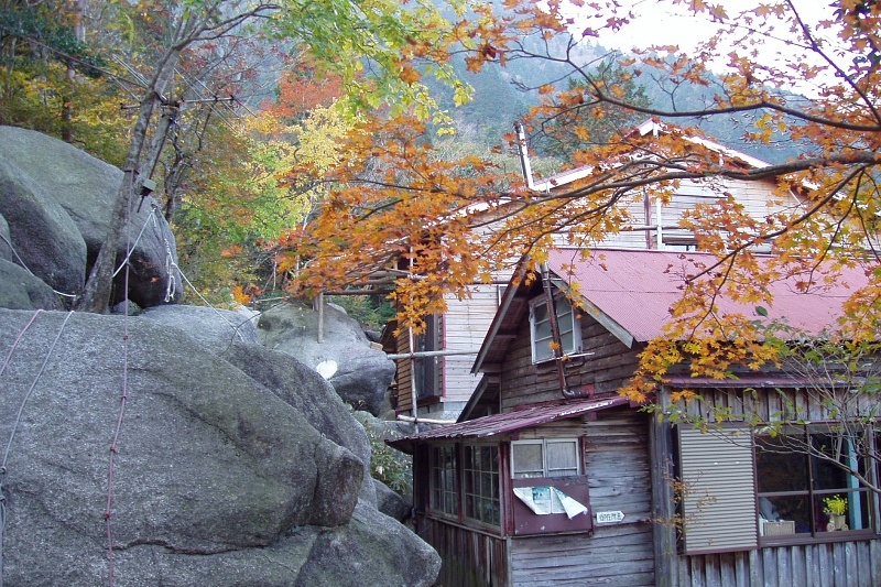 小屋の脇には岩登り練習用の岩があります。小屋の周りの紅葉がみごとでした。ここで裏道と合流して下ります。