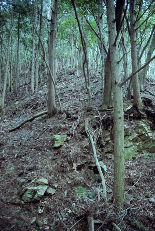 上は北西向きに向きを変えた尾根。岩が出てきました。下はさらにその先、植林が終わり、アセビの生えた二次林を登っていきます。
