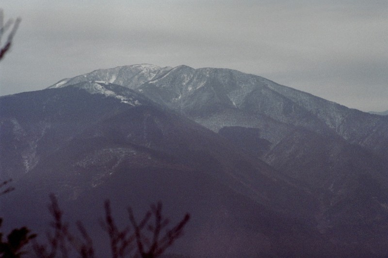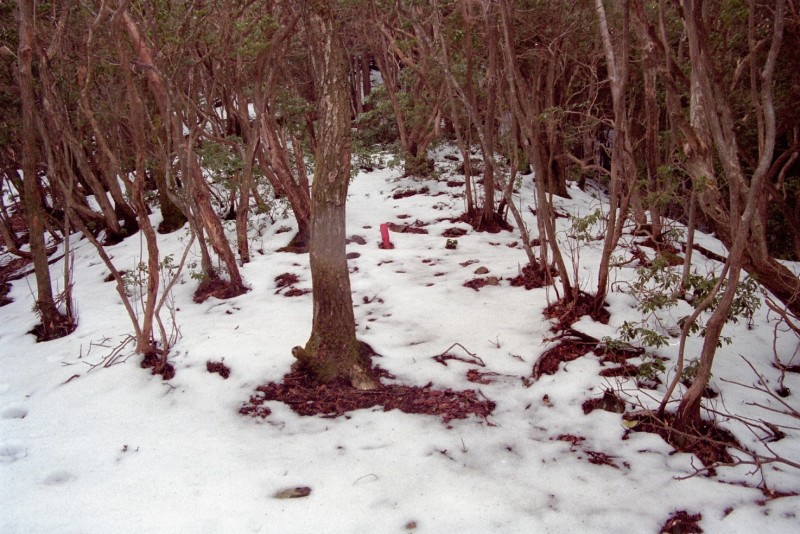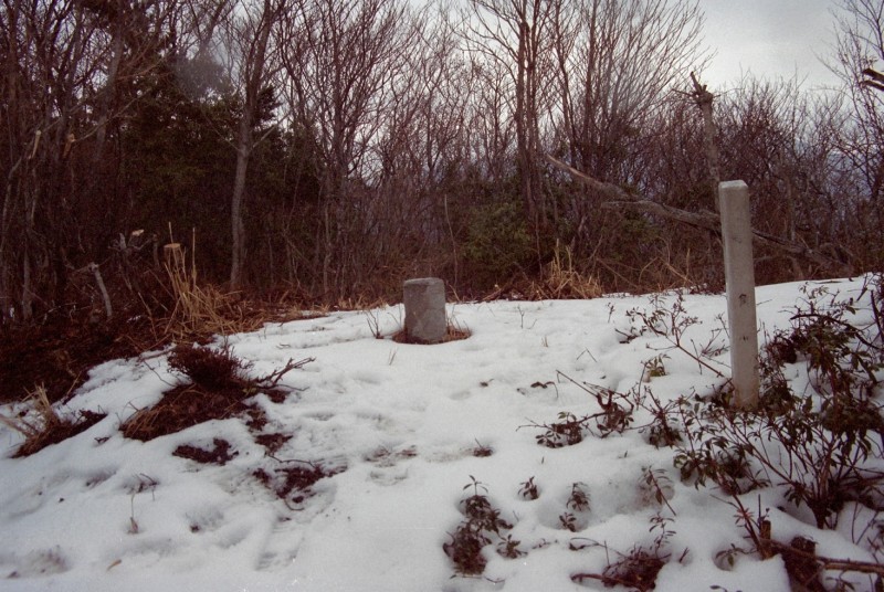三角点の右に少し下ったところが展望台といって良いほどの眺望ポイントです。そのなかでもサクラグチの印象は強烈です。写真を撮り終わったら、奥草山に急ぎました。標高差もわずかで、思ったより早く着きました。でも、フィルムが切れて、写真は撮れませんでした。帰りは登路をそのまま引き返しました。無精してアイゼンをつけたまま下ってきたら、片方をどこかに落として来ちゃいました;;。
