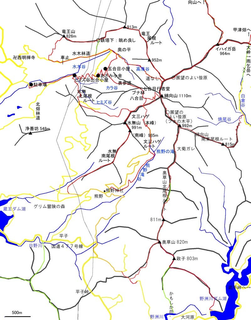 ルートは西から綿向山に登り詰める表参道といわれる登山道、水木林道からまず竜王山に登り稜線づたいに綿向山まで登る竜王尾根ルート、水無山の北尾根から水無山に登り八合目あたりで表参道と合流する水無北尾根ルート、そして雨乞岳から延々と続く尾根を経て、あるいは甲津畑からこの尾根の途中の大峠に達してイハイガ岳を経て綿向山に登るルート、ヒミズ谷を詰めるルート(管理人未踏)、高落谷を詰めるルート、南の熊野集落から水無南尾根を登るルート、熊野の滝から文三ハゲを登るルート、奥草山からの長い尾根を縦走するルート、東の白倉谷から綿向山から南東に延びる尾根を通って登るルートなどがあります。表参道はこの山を愛する熱心な人々に守られ、よく整備されています。大きな駐車場、合目を表す看板、ルート中三カ所の小屋・・・など、安全に登るならこのルートが一番でしょう。綿向と一緒に竜王山や水無山の山頂を踏んでくるのもいいコースになります。竜王山からはすこし距離があるので、時間配分には注意が必要です。また、奥草山や雨乞岳からのルートはさらに長く迷いやすいところもあるので要注意です。また、白倉谷から北の大峠に登るルートは、2016年現在、谷道崩壊のため不通となっています。