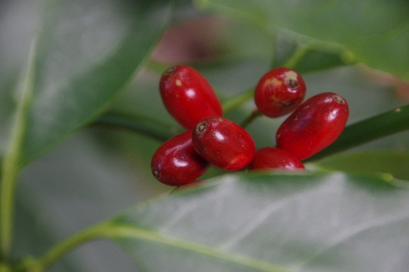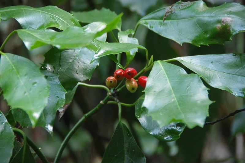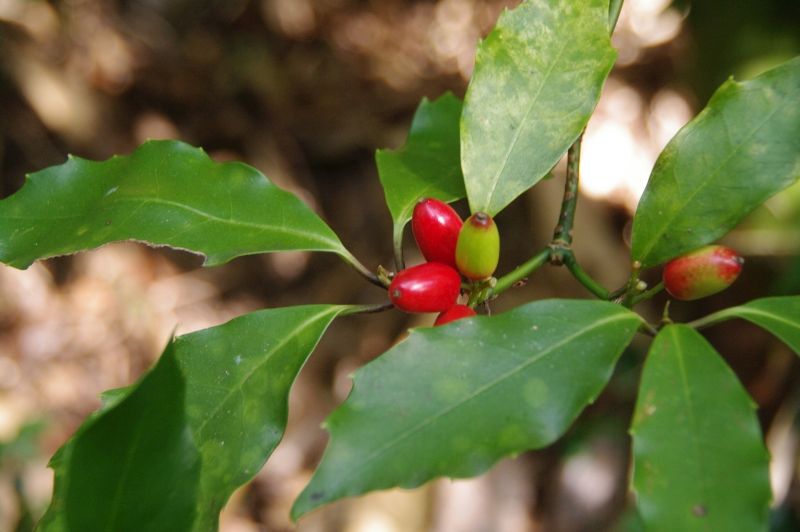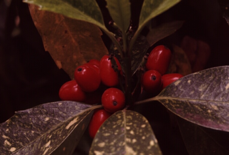 庭先に秋から早春にかけて真っ赤な実がなる木です。なかなかいい艶をしています。園芸種の葉にはよく斑入りが見られます。