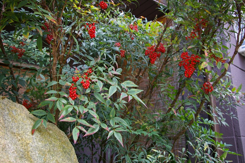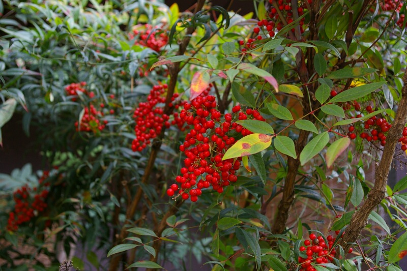 おなじみ、南天です。中国原産で、初冬の庭で色づくきれいな実の代表です。夏の花はこちら。ほとんどは、庭木や公園で