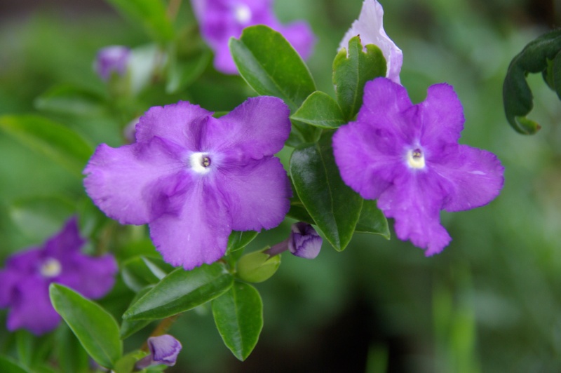 ナス科の花です。咲いたときは濃い紫色ですが、次第に色が薄くなり、最後はほぼ白くなります。1-3はニオイバンマツリで、よい香りがします。