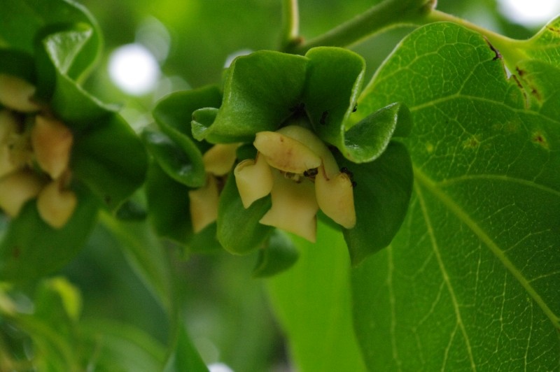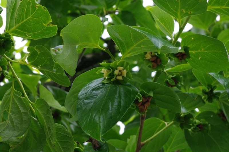 柿は6月の初めごろ、目立たない薄黄色の花を付けます。巨大な萼は、そのまま柿の実のヘタになります。よく似た花に