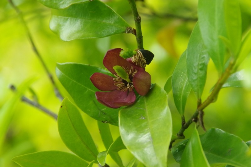 中国南部原産の常緑性の花木です。花が葉腋に付くのが特徴です。花弁は1-3のようなワイン色か、黄白色。雌蕊は淡紫色を帯びています。