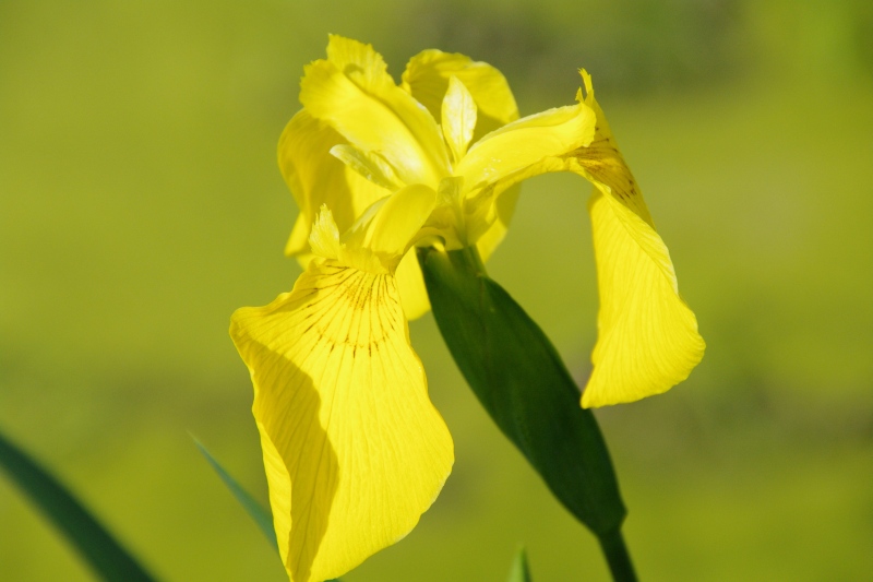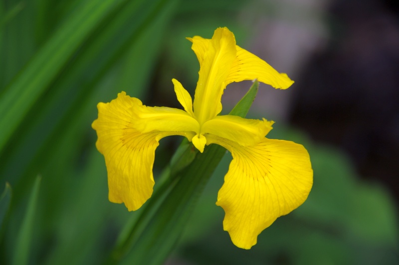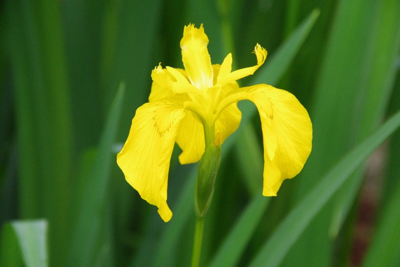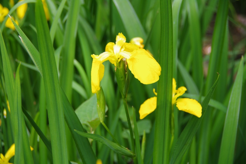 水辺に咲く黄色いアヤメです。3つの内花被片はアヤメのように直立せず、斜めになっています。水辺で野生化しているものも多く見られます。