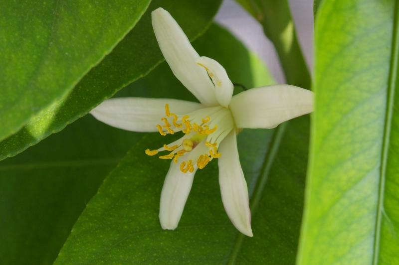 レモンのつぼみ、花です。花は芳香を漂わせます。4は花弁がそろそろ散る花。内部には果実のもとができてきています。