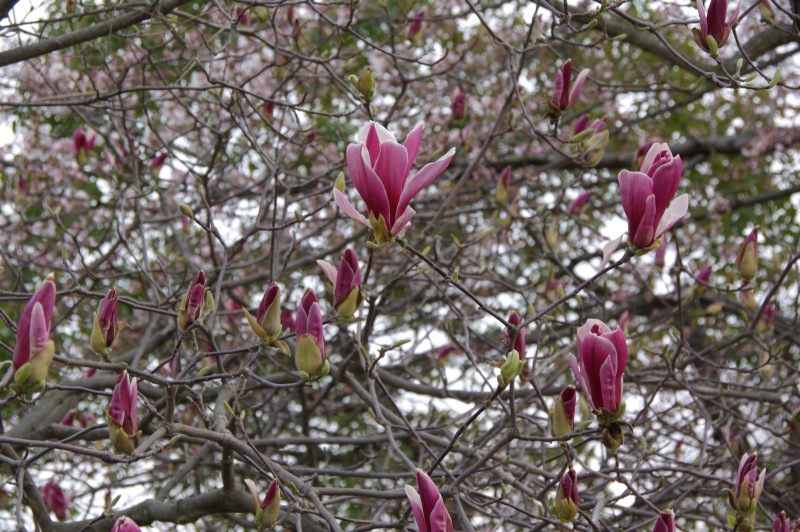 ワインレッドの美しい色で、葉よりも先に花が開きます。