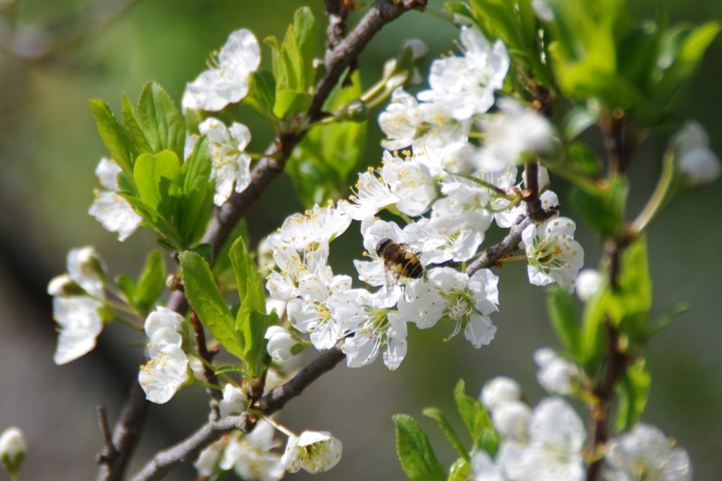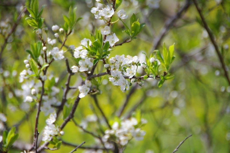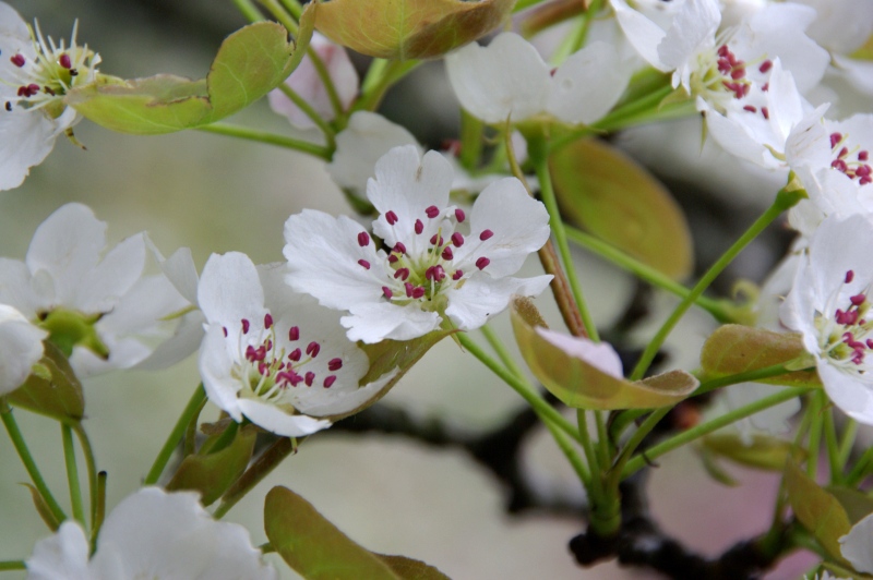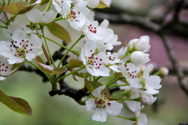 ナシの花は白くて桜の少し前に咲きます。蘂は1-2のような濃いピンクのものから、3-6のような黄色まで、