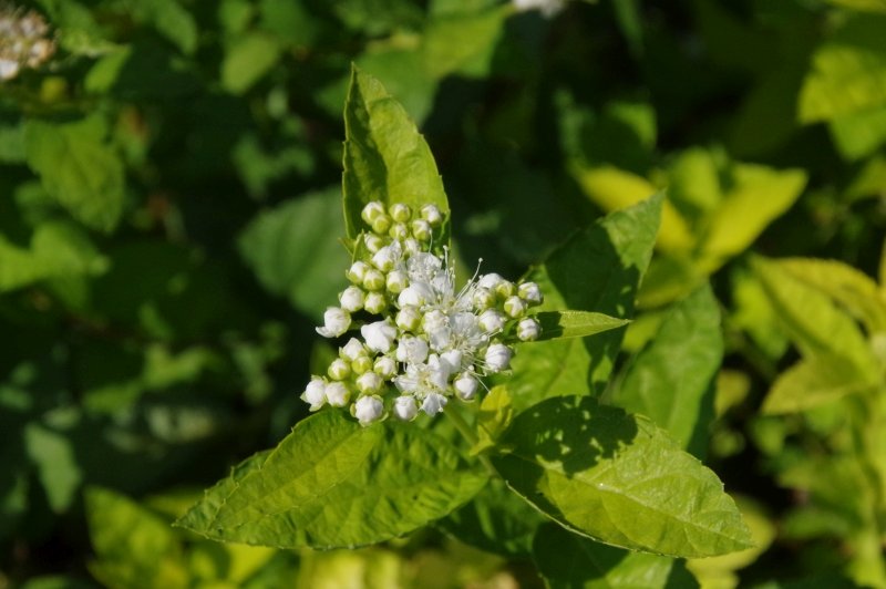 近年、園芸種としてよく植えられるようになってきました。5〜7月、白い習合花を枝の先端に付けます。