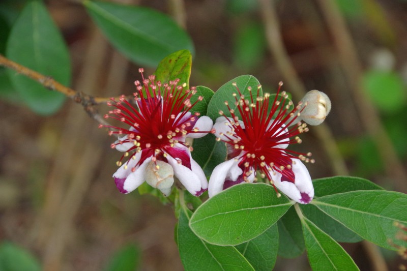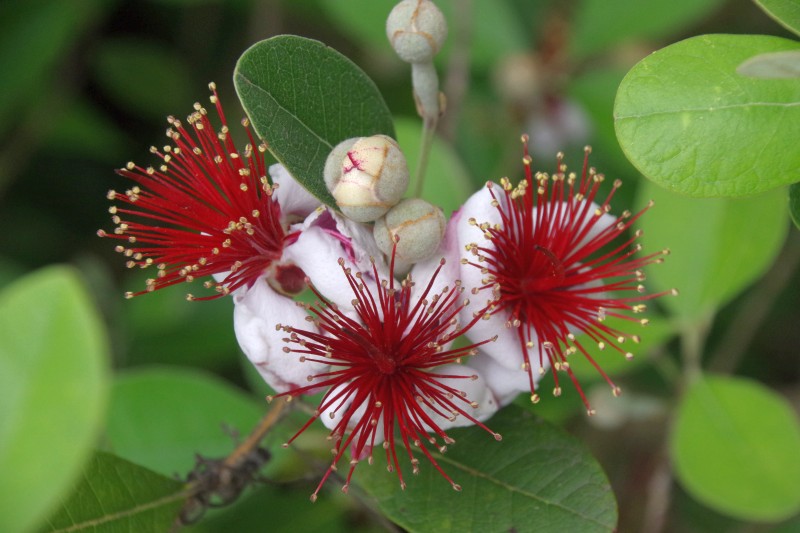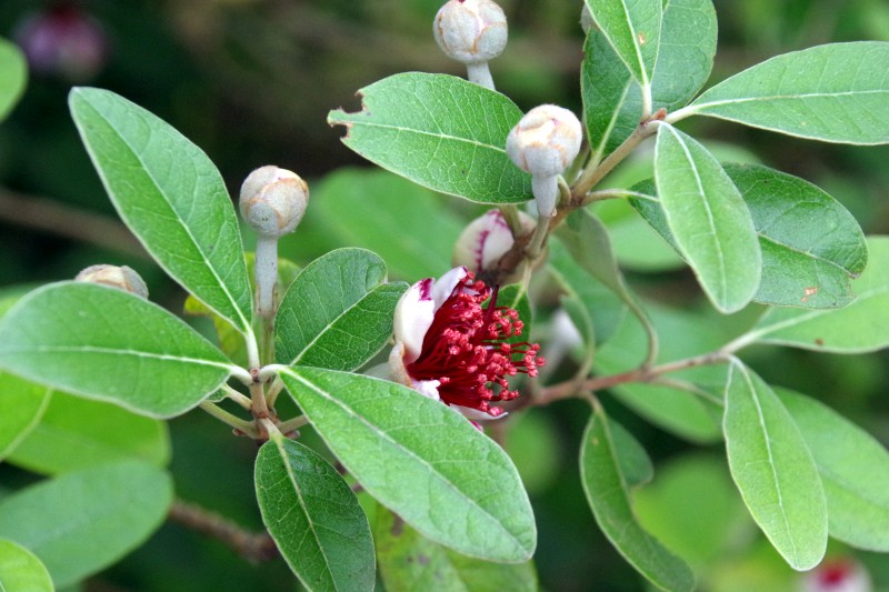 ウルグアイやパラグアイ、ブラジル南部など南米原産のフトモモ科の常緑果樹です。秋になる果実が食用ですが、この花も