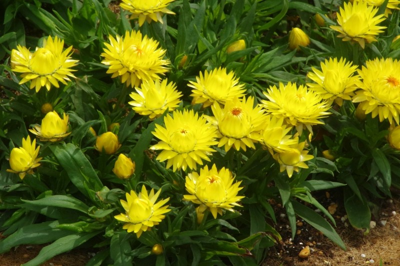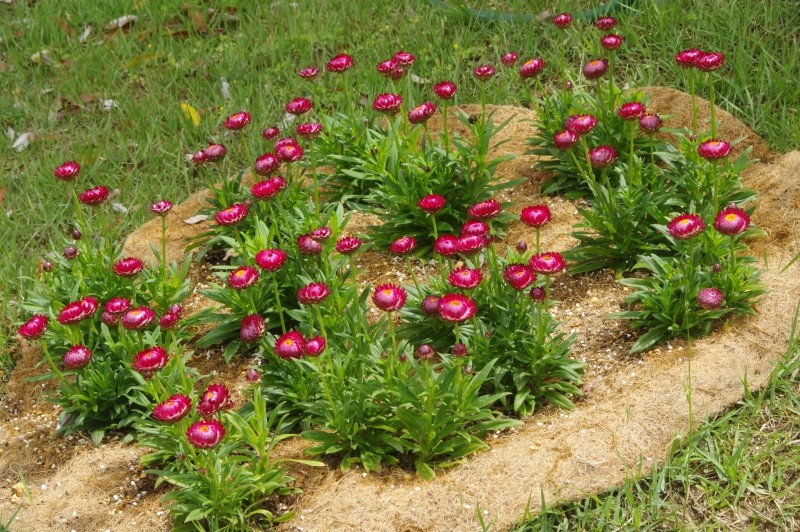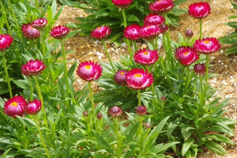 帝王貝細工やムギワラギクの名でも知られています。総苞片が硬く、かさかさとした触感です。オーストラリア原産のキク科の花で、花壇などでよく見かけます。