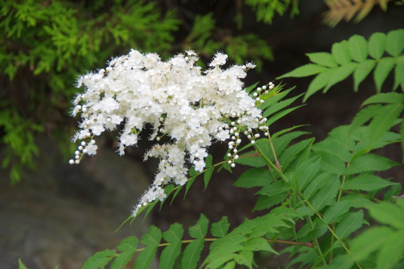 庭木や公園に植えられるバラ科の落葉低木です。花はシモツケ、葉はナナカマドに似ています。