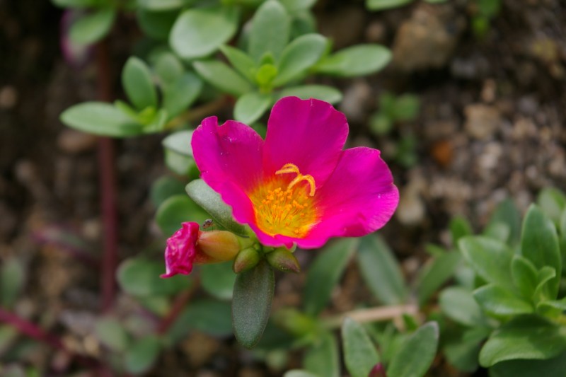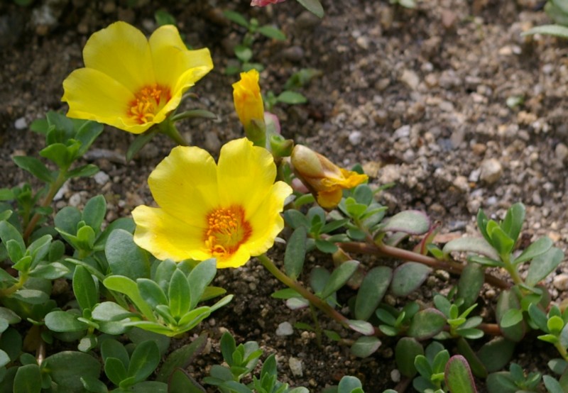 の近縁種で、葉っぱが平たい種です。花屋さんでは「ポーチュラカ」で売られています。