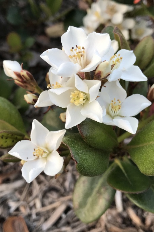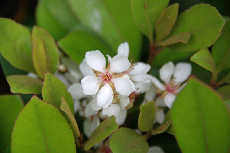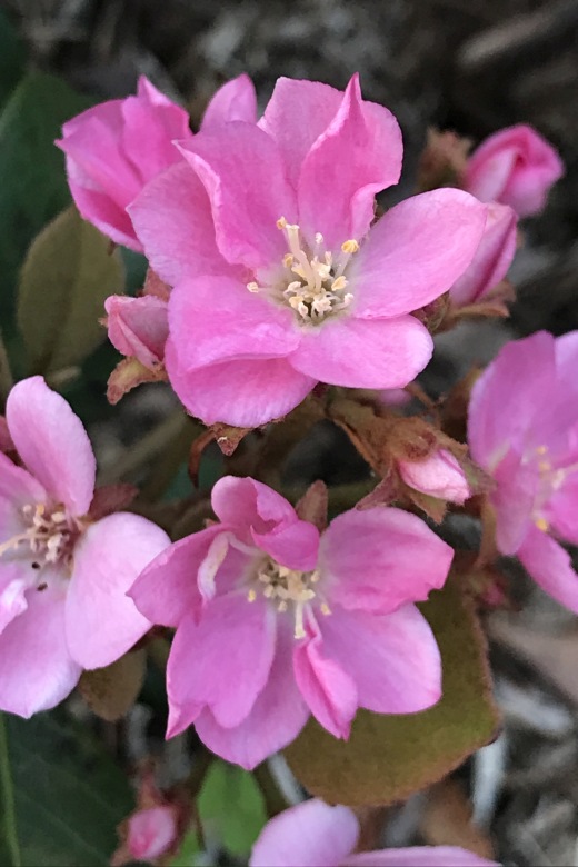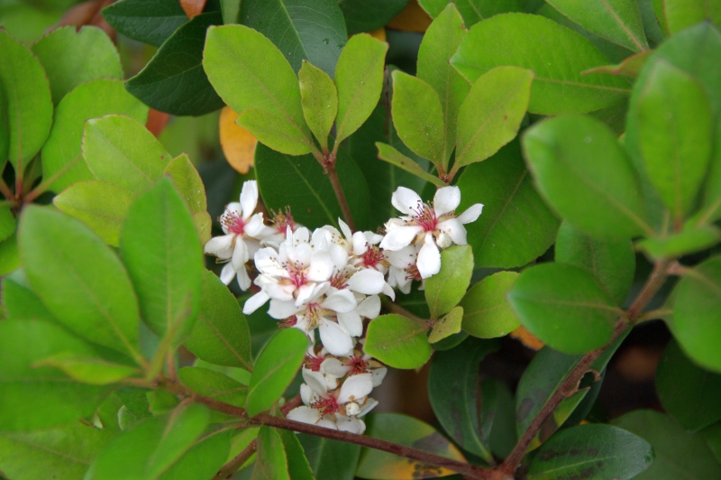 街路樹によく使われるバラ科の常緑低木です。花はバラの雰囲気を持っています。4はピンクのベニバナシャリンバイ。秋の実は
