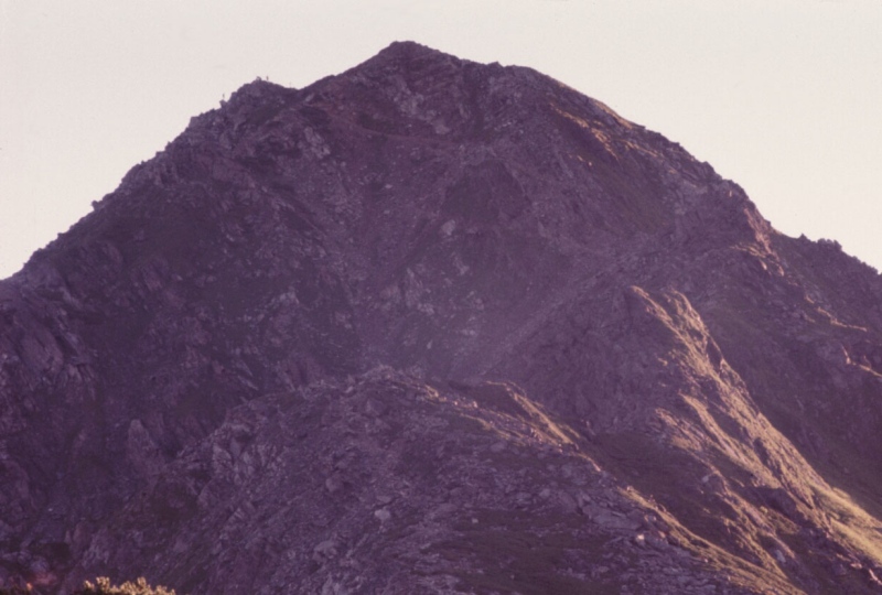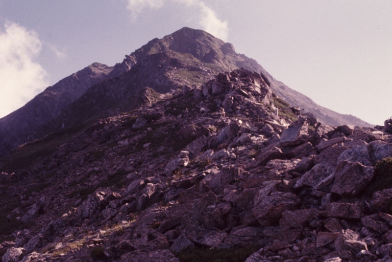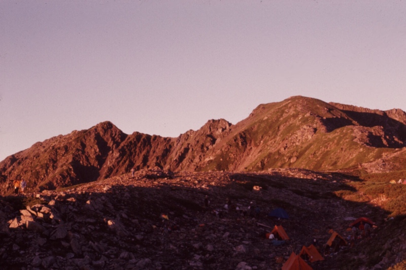 ずいぶん古いスライドなので、ちょっとセピア系変色が来てるような気がします。なんせ高校時代のことです。このときの山行では、広河原から入り、大樺沢、八本歯のコルを経て北岳山荘でテント(泊)。翌朝、北岳往復後、中白峰から間ノ岳を経て農鳥小屋(泊)、3日目は仙塩尾根を南下して塩見岳を越え、塩見小屋(泊)、4日目は三伏峠から下り、鹿塩へ。そんな山行でしたが、通過時刻などの詳細は今では不明です・・・途中、間ノ岳の山頂付近で雷に遭い、すごい怖い思いをしたことを覚えています。写真はなぜか北岳付近しか残っていません;;