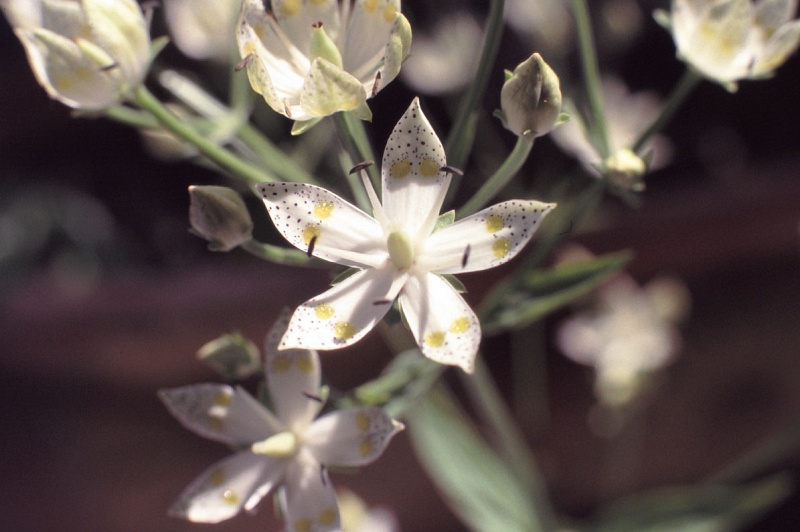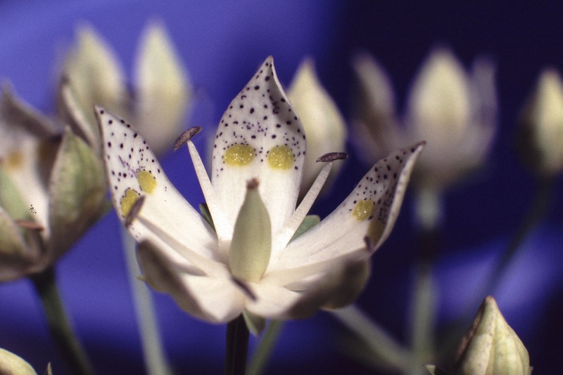 きれいな星形の花で、花びら先端部の黒い斑紋と、真ん中の大きな2つのグリーンの斑紋が目を引く花です。