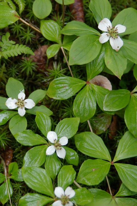 亜高山から高山の針葉樹林の林床に生える常緑の多年草です。ミズキ科だけのことはあり、ハナミズキやヤマボウシの花と似ています。