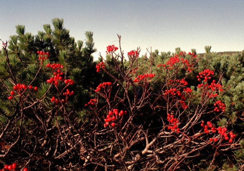 高山性のナナカマドです。葉の下半部にギザギザが無いのが特徴です。また、花や実は上向き。秋にはみごとに紅葉します。低山のナナカマドはこちら。