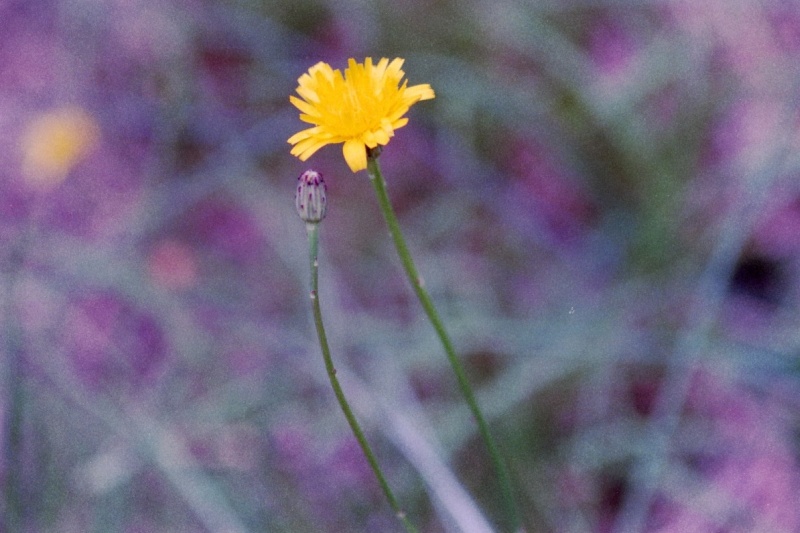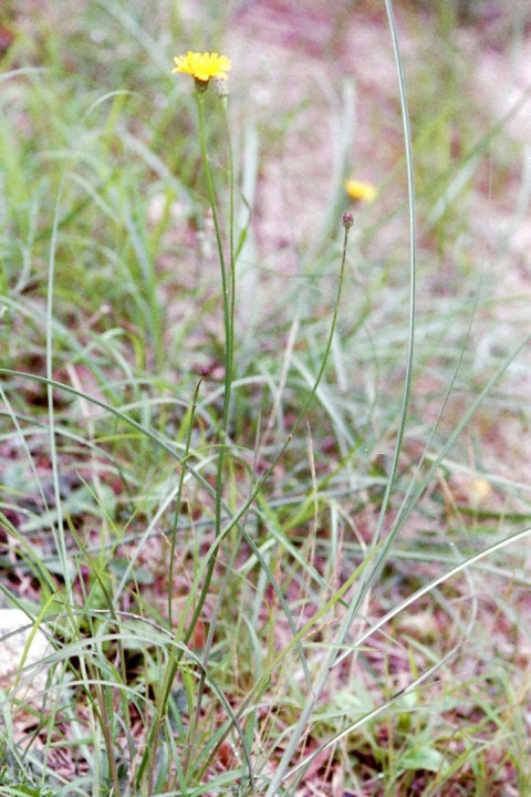 花はタンポポやコウゾリナとよく似ていますが、葉は根生葉のみです。そこから50cm以上にもなる細い花柄を伸ばします。