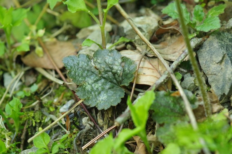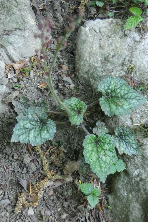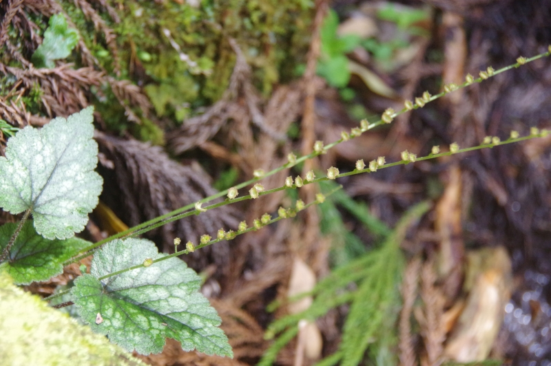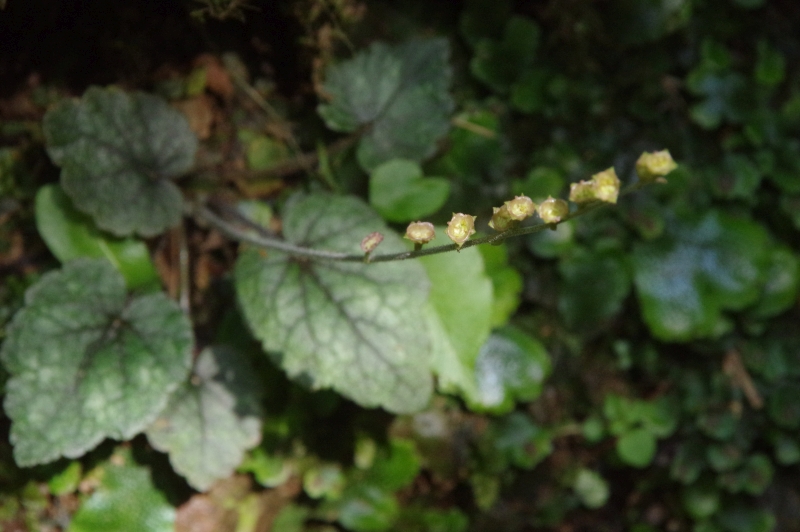 渓流沿いに、半分水滴を浴びながら咲く花です。葉は広卵形・基部はハート形で紫色を帯び斑が入ることが多いようです。