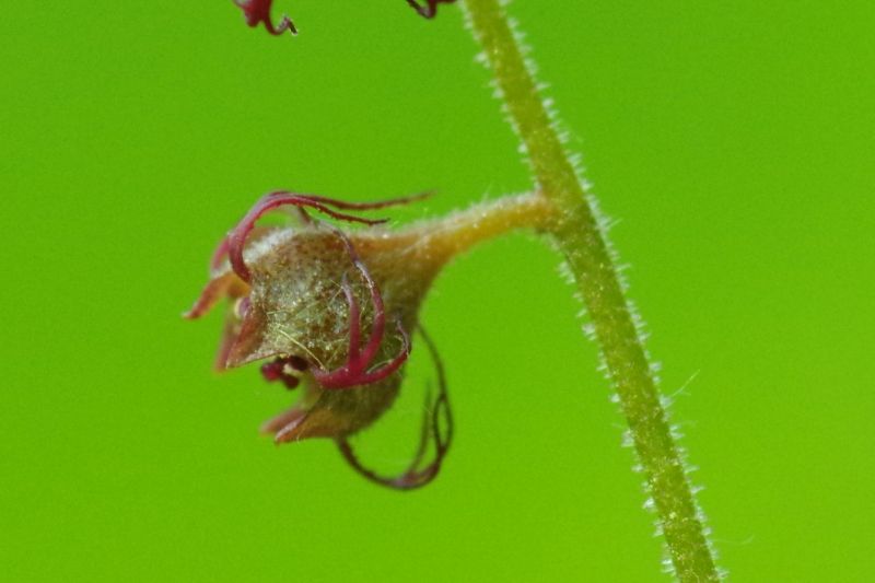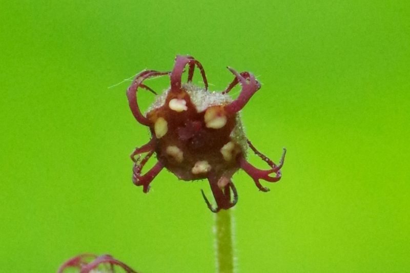 花は春に咲き、花弁は紅紫色で羽状に3-5裂して後ろに反り返り、形は魚の骨のよう。5-8は花が終わって、果実になりかけています。
