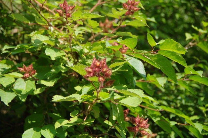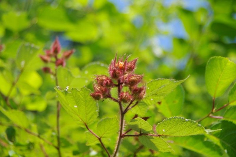 枝や実に赤紫色の腺毛が密生し、刺があるキイチゴです。日当たりのよいところに生えます。