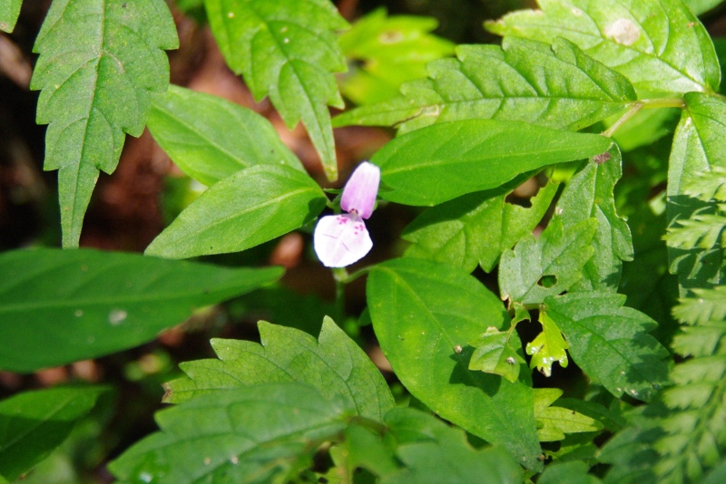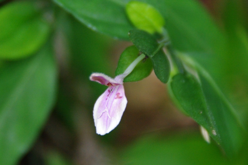 それよりも独特の花、つまり2唇の花弁状の部分と白い蘂が印象的な花です。