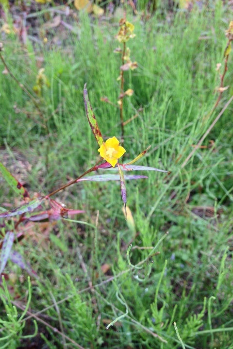 別名アメリカミズキンバイ。アメリカ原産の帰化植物で、田んぼの畦や湿地に生える一年草です。細長い葉が互生します。