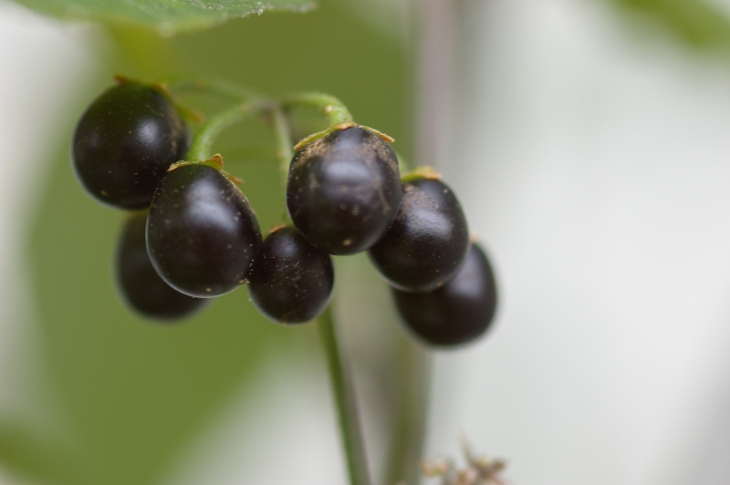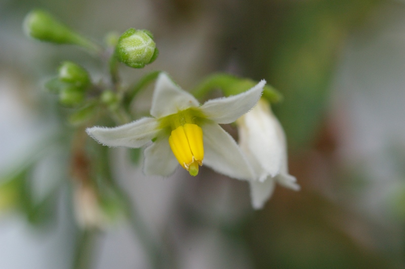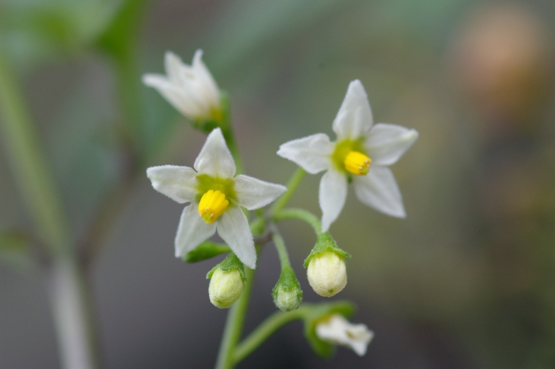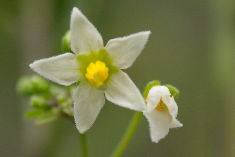 白い星形の花が咲き、黒い実がなります。近縁のアメリカイヌホオズキは、実の光沢がより強く、花が少し小さいようです。