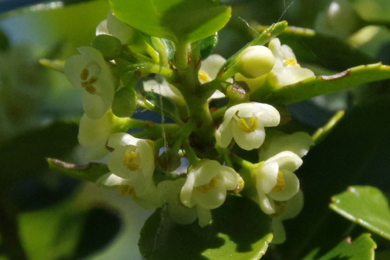 初夏、葉の付け根に小さな白い花を付けます。アップでよく見ると、たいへんかわいらしい花です。